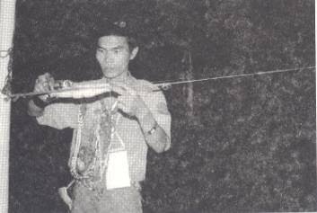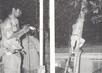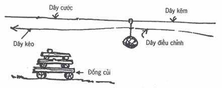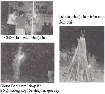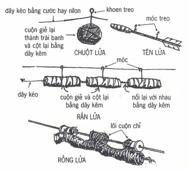 – Căng dây kẽm từ một thân cây hay một điểm cao đến đống củi, làm sao cho một độ dốc trên 400. Đầu dây kẽm (phía đống lứa) chúng ta nối bằng một đoạn dây nilon ngắn, để sau khi lửa bùng cháy thì dây sẽ đứt, không gây trở ngại cho việc trình diễn.