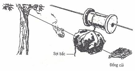 – Dùng ống sắt, lon bia đục hai đầu, lõi ống chỉ… luồn qua sợi dây kẽm, quấn giẻ vào rồi dùng dây kẽm cột lại.