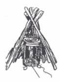 Dùng một hộp kim loại bất kỳ (đủ lớn để có thể chứa một cây nến đang cháy). Cắt một nửa như hình bên. Trong hộp để một cây nến đang cháy gắn trên một miếng ván nhỏ, có cột một sợi dây để kéo. Tất cả để giữa một đống củi được sắp xếp một cách khéo lẻo. Khi đến thời điểm, các bạn kéo nến ra khỏi hộp thiếc, nên sẽ bắt lửa vào các bùi nhùi có tẩm dầu để sẵn. Lửa sê bùng lên.