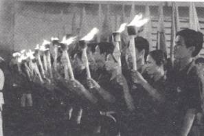 Sau khi đơn vị đã ổn định xong đội hình, người quản trò tạo một bầu không khí trang nghiêm, huyền bí rồi gọi lớn: “Xin mời thủy hỏa thần đến ban cho chúng tôi ánh sáng”. Khi đó người ở dưới nước bí mật châm lửa vào đèn cầy trên bè rồi nương theo bóng đêm để bơi vào bờ. Một người khác bí mật kéo bè vào. Khi bè đã cập bờ, quản trò dùng đuốc để châm lửa từ bè rồi chạy đến trao cho trại trường để châm lửa vào đống củi.