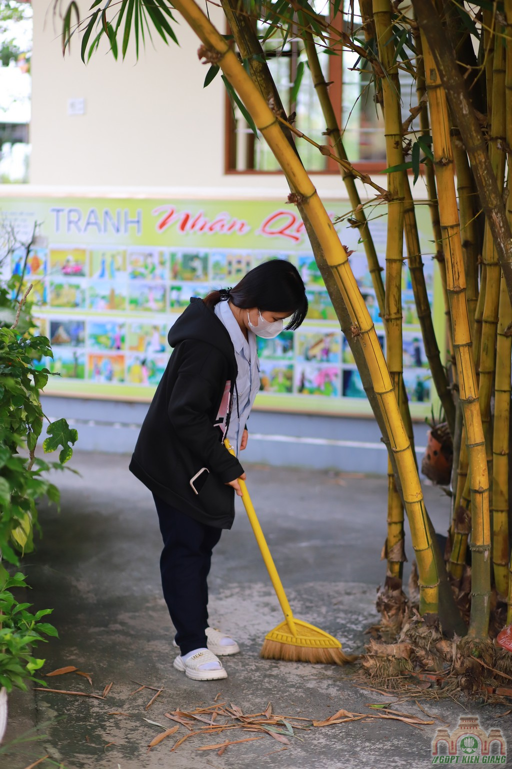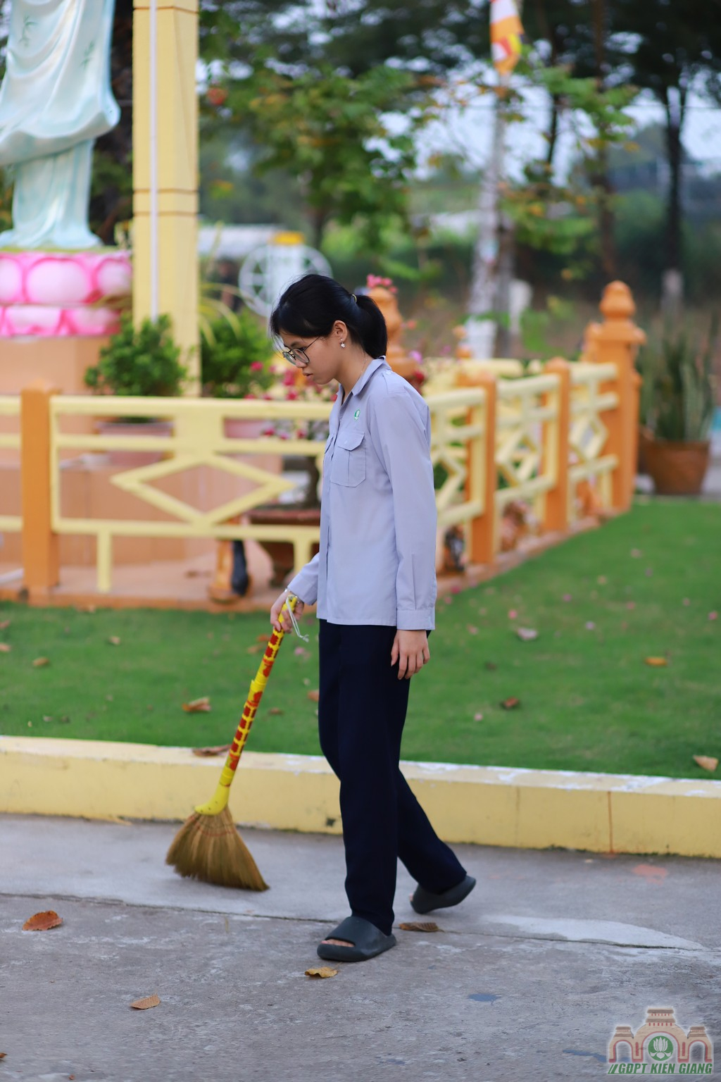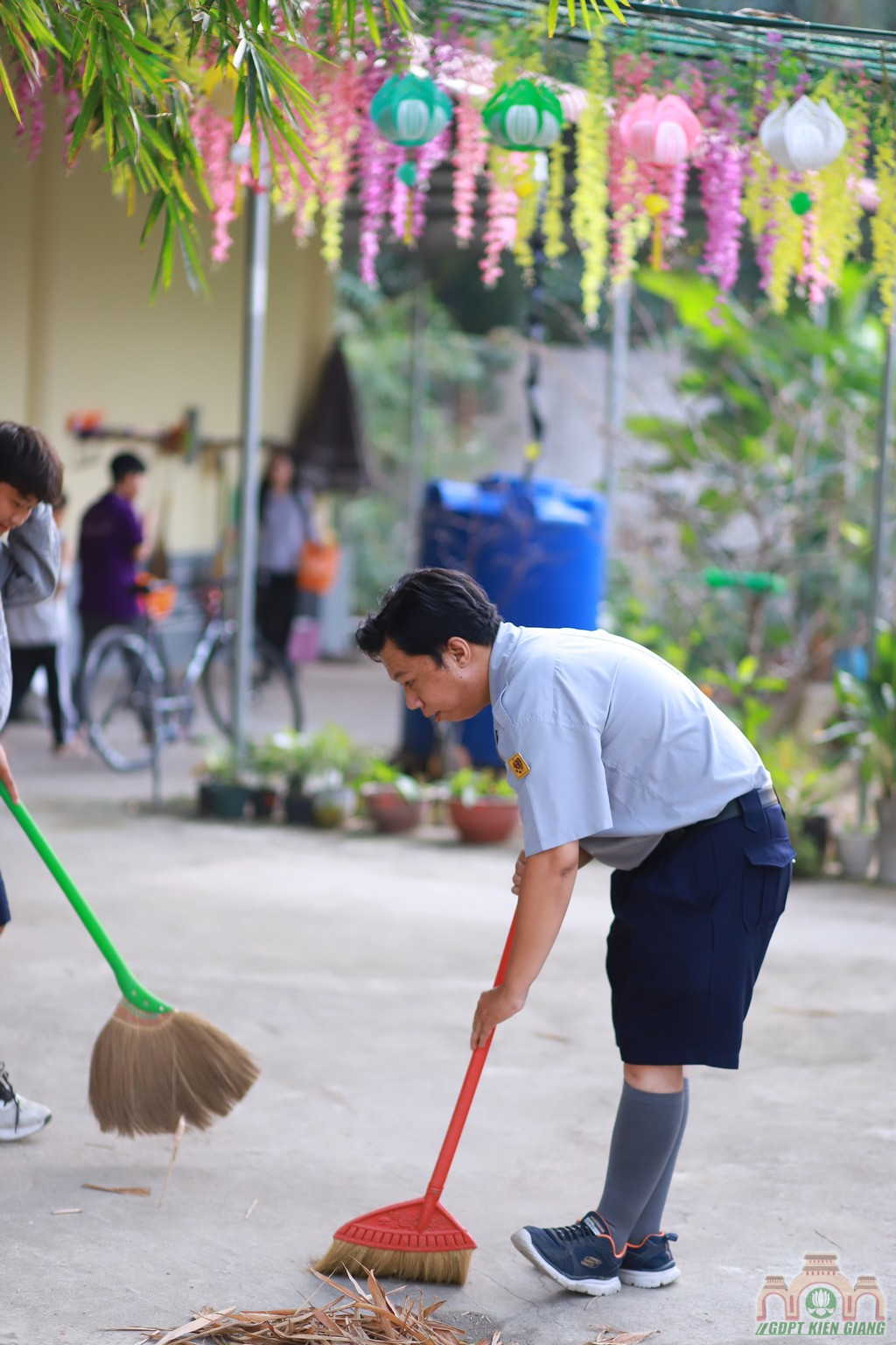 Trước khi kết dây thân ái, toàn thể gia đình cùng nhau tham gia vệ sinh chùa, dọn dẹp và trang trí để chuẩn bị đón năm mới. Hoạt động này không chỉ giúp các em rèn luyện tinh thần trách nhiệm mà còn tạo nên không gian sạch đẹp, trang nghiêm cho chùa.
