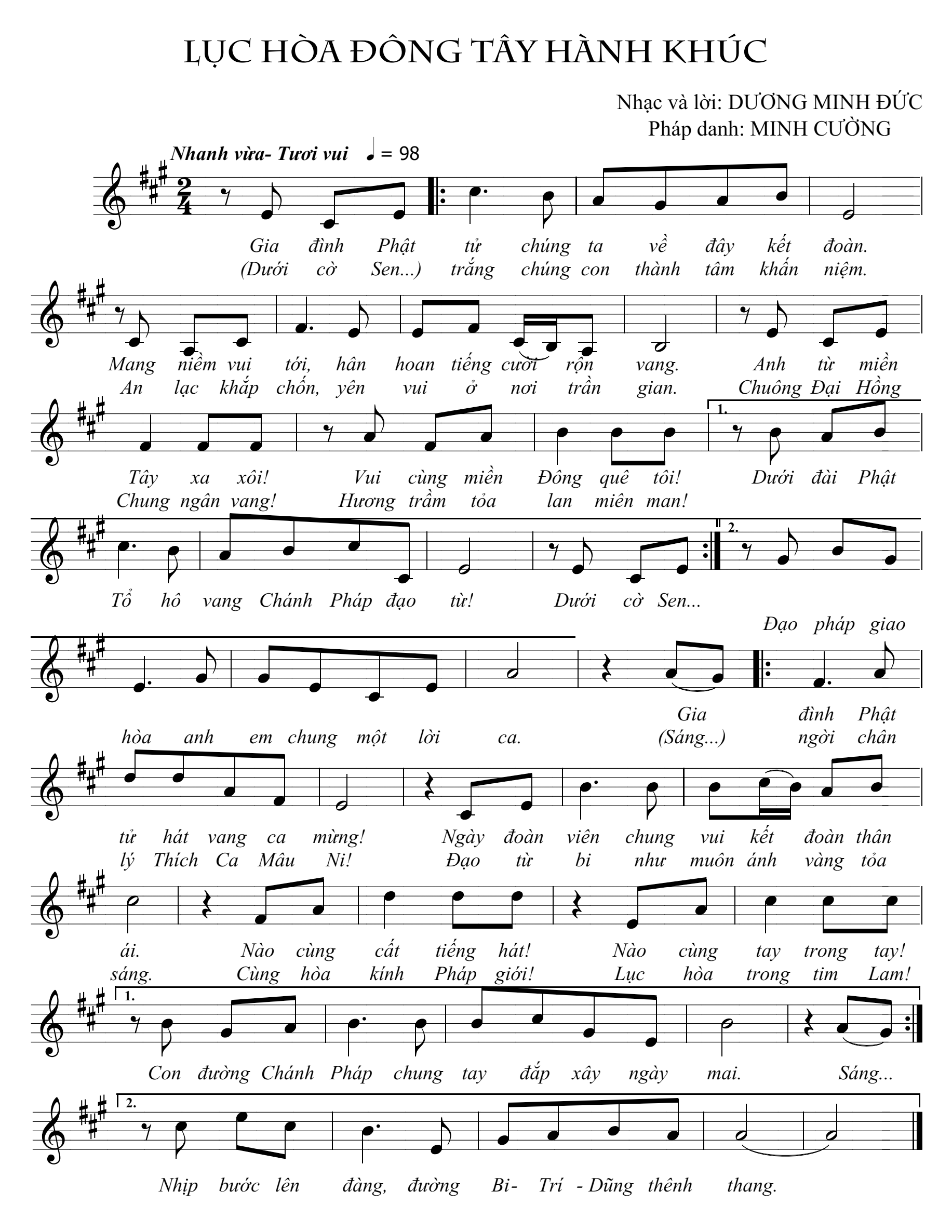 Bài hát Lục Hòa Đông Tây Hành Khúc do anh Minh Cường Dương Minh Đức ( cựu huynh trưởng GĐPT Tam Bảo – Hà Tiên) sáng tác được chọn làm bài hát chính thức của trại Lục Hòa III, trại họp bạn ngành Thanh, Thiếu Gia Đình Phật Tử miền Đông, Tây Nam Bộ và Bình Thuận.