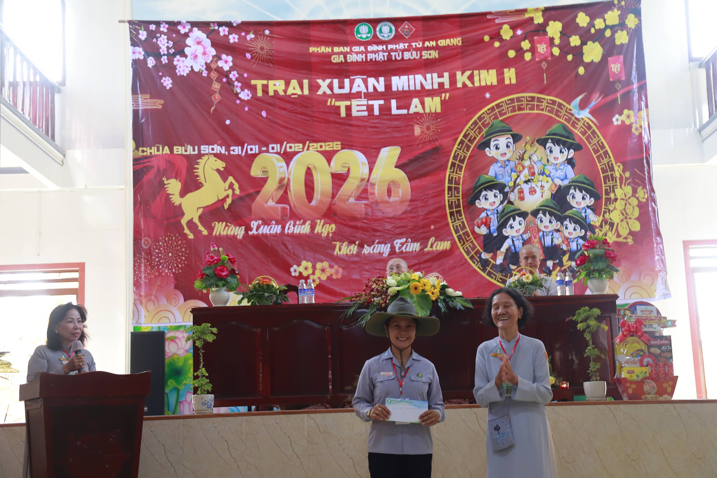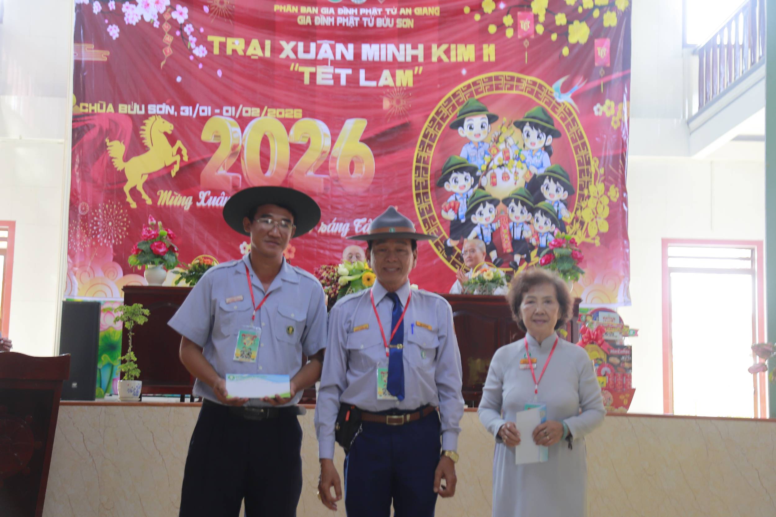 Điểm khởi đầu của hành trình là Chùa Bửu Sơn (xã Tân Hiệp), nơi phái đoàn vấn an Ni trưởng bổn tự. Đặc biệt, tại đây đoàn đã tham dự lễ khai mạc Trại Xuân Minh Kim II do đơn vị Bửu Sơn và Hòa Long phối hợp tổ chức, hòa chung không khí tuổi trẻ áo Lam đón xuân trong tinh thần kỷ luật – vui tươi – đoàn kết. Nhân dịp này, phái đoàn cũng thay mặt cấp trên trao phần quà mừng Xuân của Phân Ban Gia đình Phật tử Trung Ương đến 02 anh chị huynh trưởng trong tỉnh, như một sự khích lệ và sẻ chia ấm áp trong những ngày cuối năm.