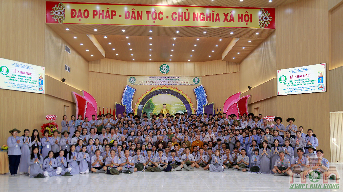 Lễ Khai mạc hân hạnh đón tiếp HTr cấp Dũng Diệu Thiện Trần Thế Mỹ – Cố vấn Phân ban GĐPT TƯ; Trung Tá Đỗ Kim Ngoan – Đại diện phòng An ninh Nội địa Công an tỉnh Kiên Giang cùng toàn thể thành viên Ban Quản trại và gần 200 Huynh trưởng trại sinh.